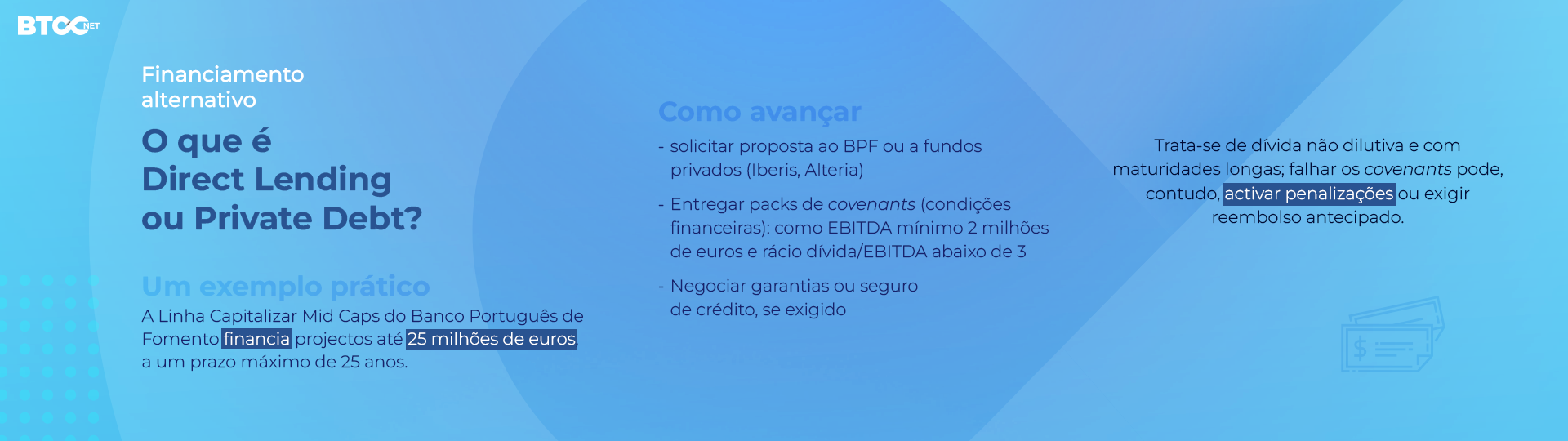 Um exemplo prático: a Linha Capitalizar Mid Caps do Banco Português de Fomento financia projectos até 25 milhões de euros, a um prazo máximo de 12 anos.